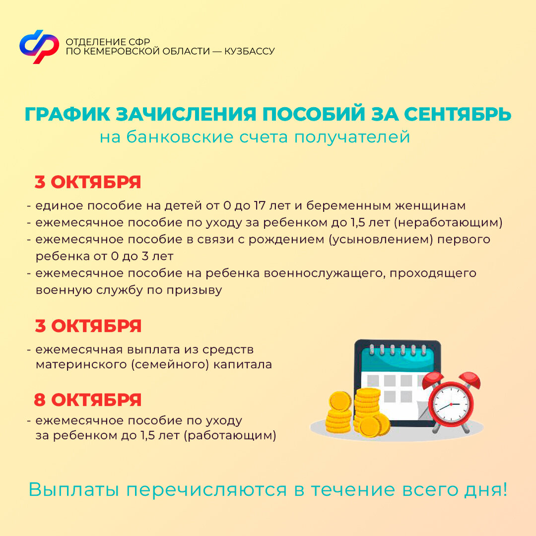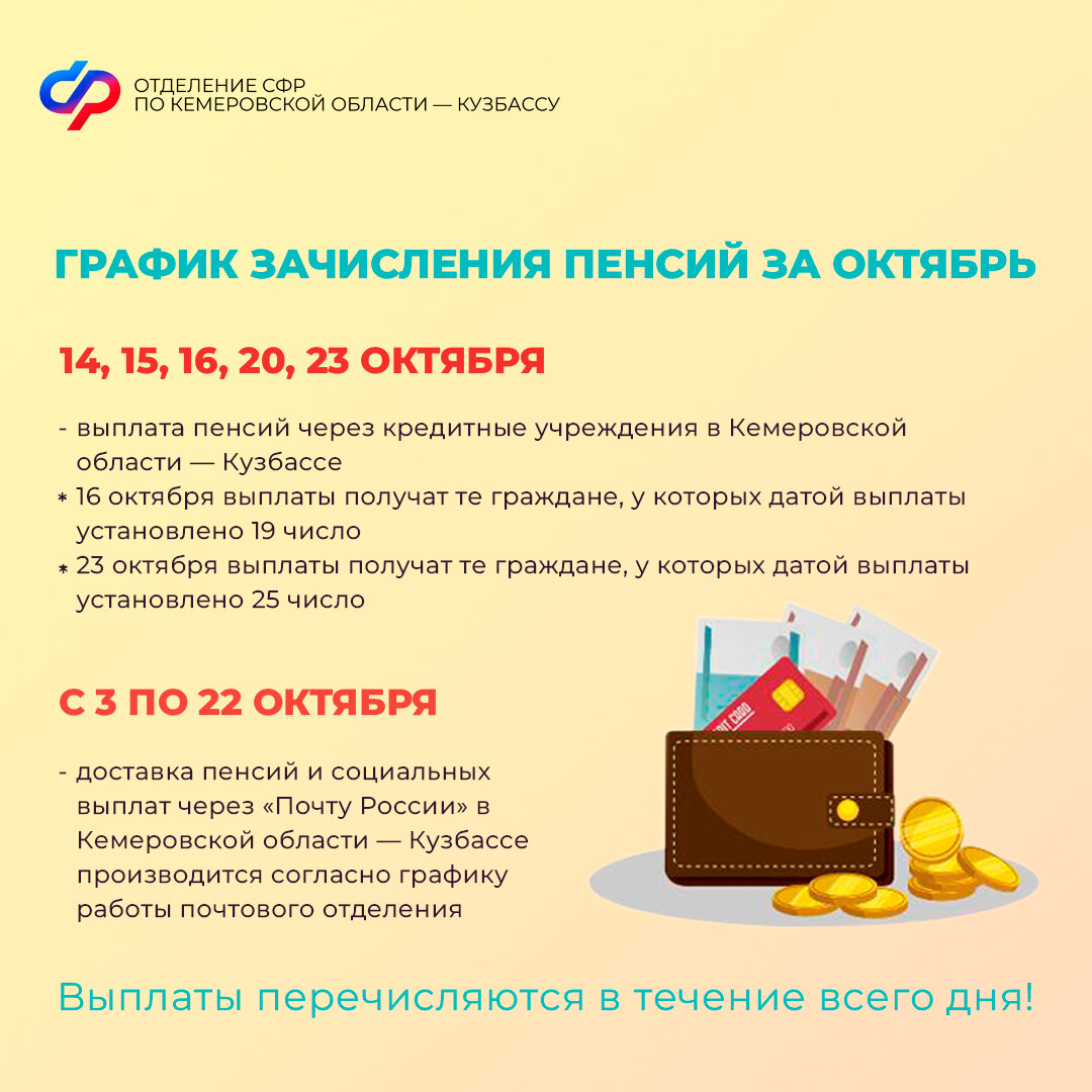 Отделение СФР по Кемеровской области напоминает: выплата пенсий и социальных выплат осуществляется за текущий месяц. Пособия перечисляются в новом месяце за предыдущий, то есть в октябре вы получите пособия за сентябрь.