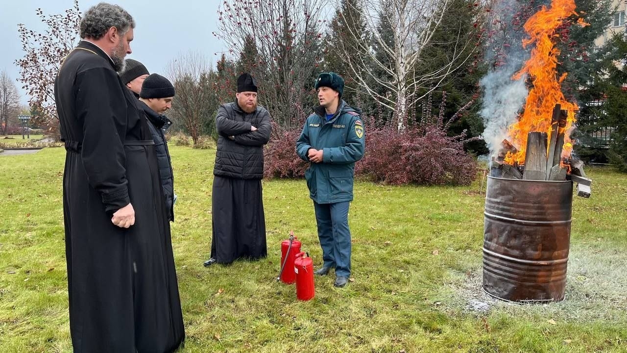 Затем сотрудники МЧС провели практическое занятие для священнослужителей на территории храма. Они показали, как правильно использовать огнетушитель при тушении пожара.