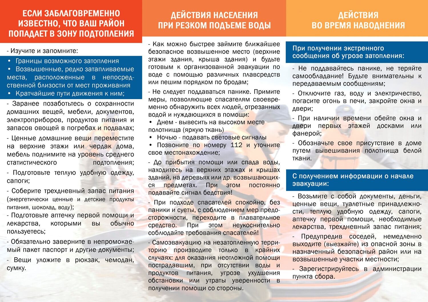 - самостоятельную эвакуацию вплавь или с использованием плавсредств проводить только в случаях угрозы жизни и здоровью, а также при необходимости оказания неотложной помощи пострадавшим.