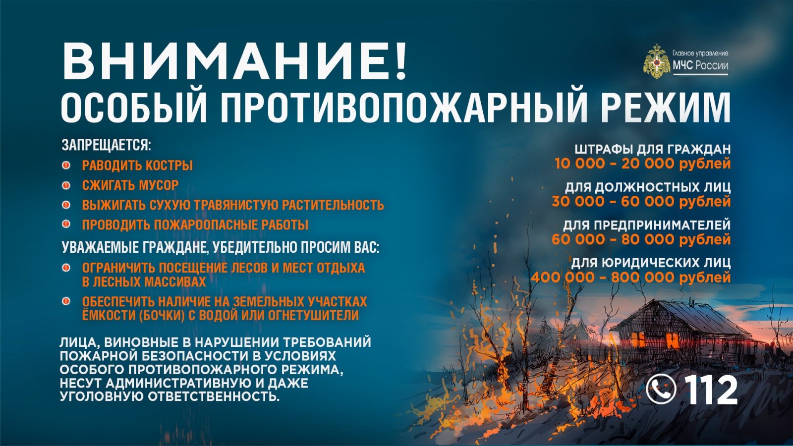 Особый противопожарный режим подразумевает строгий запрет использования открытого огня в лесах, на сельскохозяйственных угодьях, на приусадебных участках частных подворий, дачных и садовых обществ.