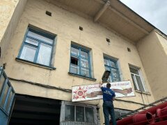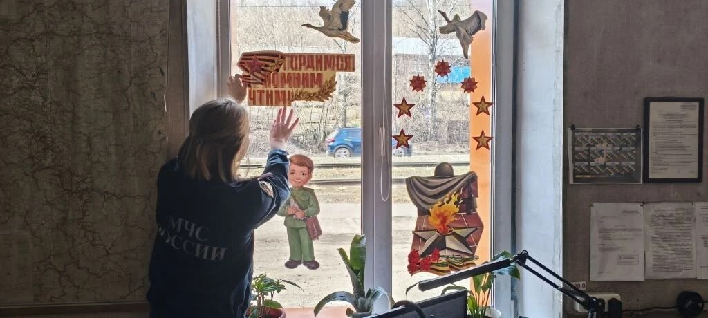 Так, окна зданий, пожарно-спасательных частей украсили тематические плакаты, фотографии и символы победы.